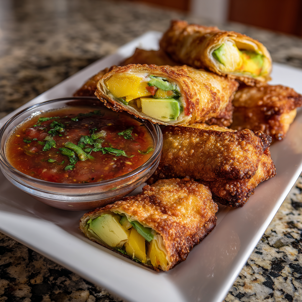 Crispy avocado egg rolls filled with creamy avocado, melted cheese, and herbs, served with a bold, crave-worthy dipping sauce that goes with everything.