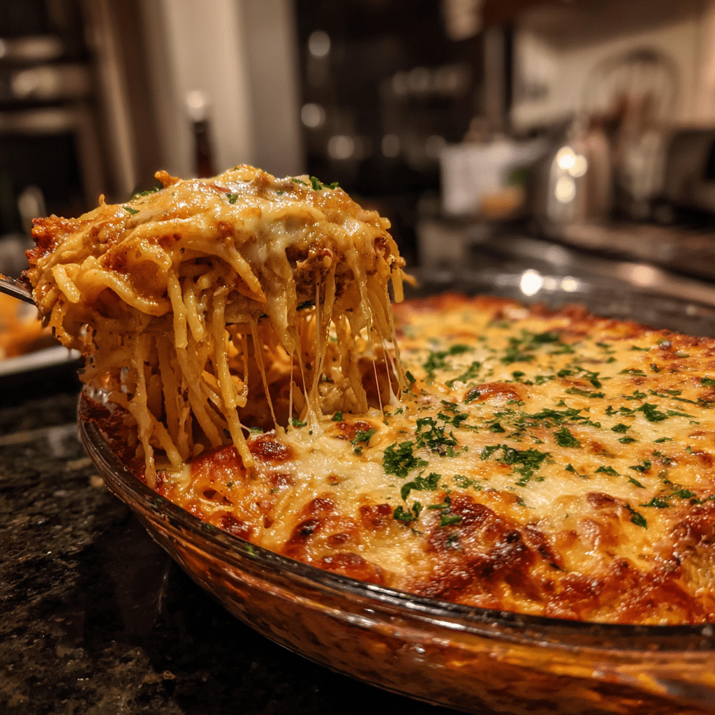 A comforting baked spaghetti casserole layered with creamy cream cheese, marinara sauce, and melted cheese, baked until bubbly and golden.