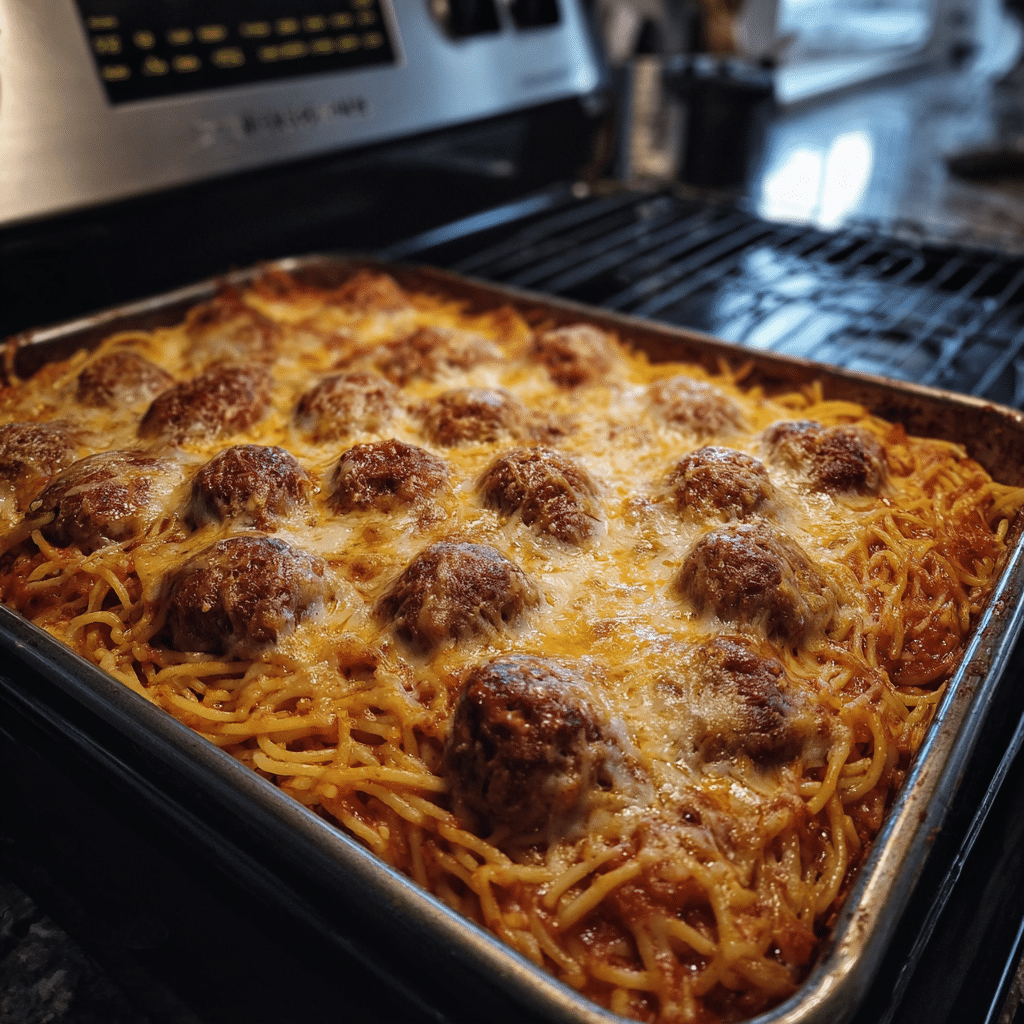 A hearty comfort dish with spaghetti, juicy meatballs, marinara sauce, and melted cheese baked to golden perfection.