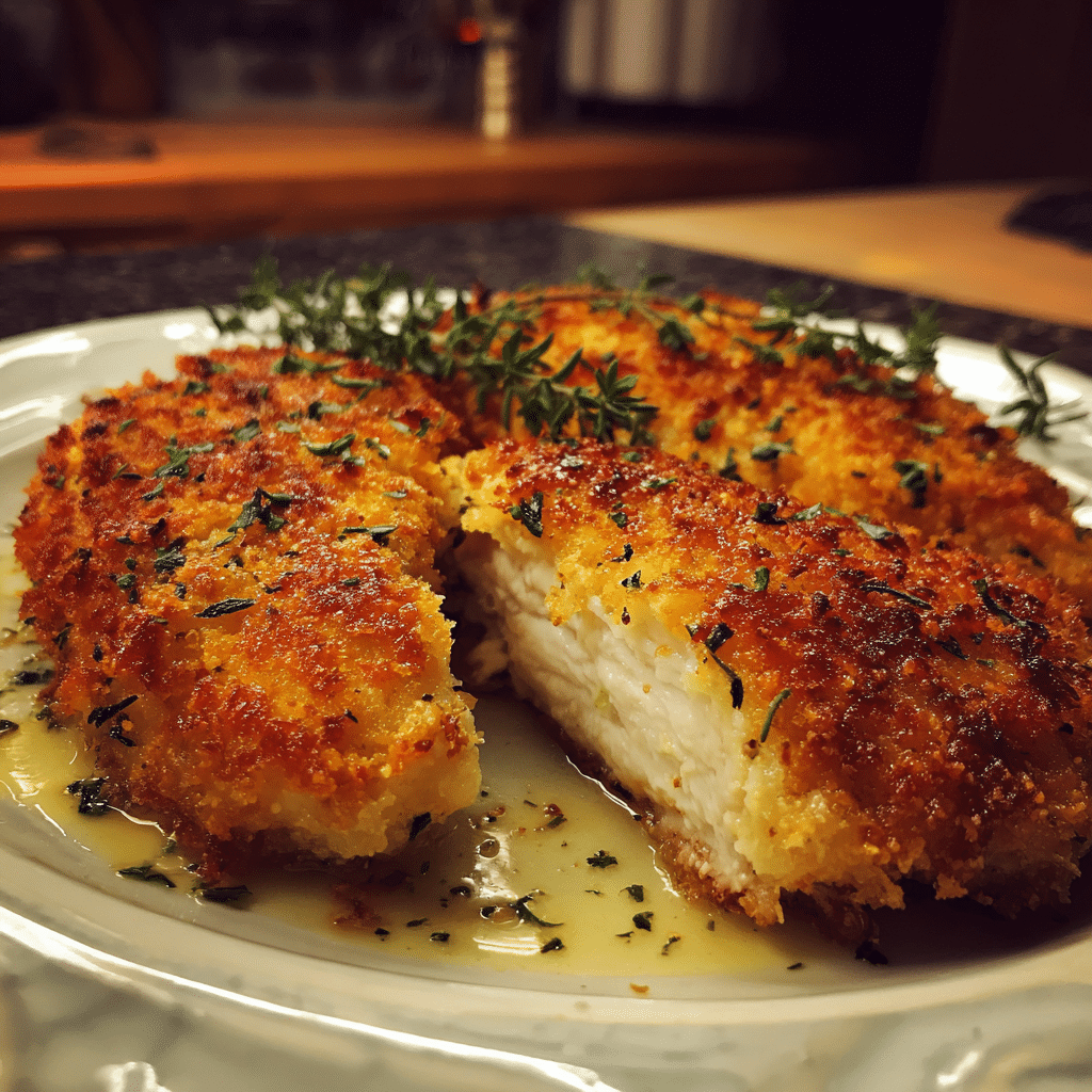 Crispy, golden chicken breasts coated in a flavorful Parmesan and breadcrumb crust, pan-seared to perfection for a delicious and easy dinner.