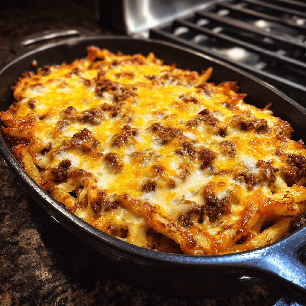 - Bake uncovered for 30–35 minutes until fries are crispy and cheese is melted and bubbly.