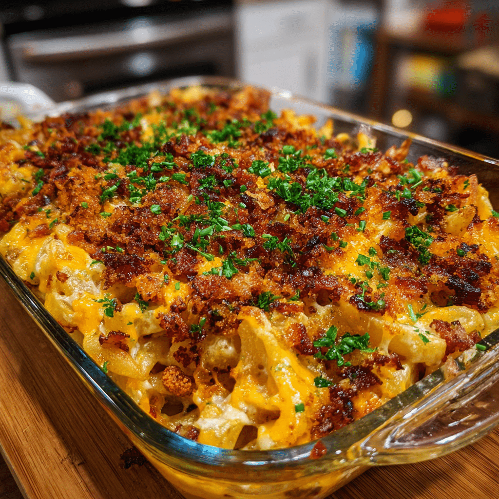 A crowd-pleasing casserole made with crispy French fries layered in a rich, cheesy sauce and baked until bubbly and golden.