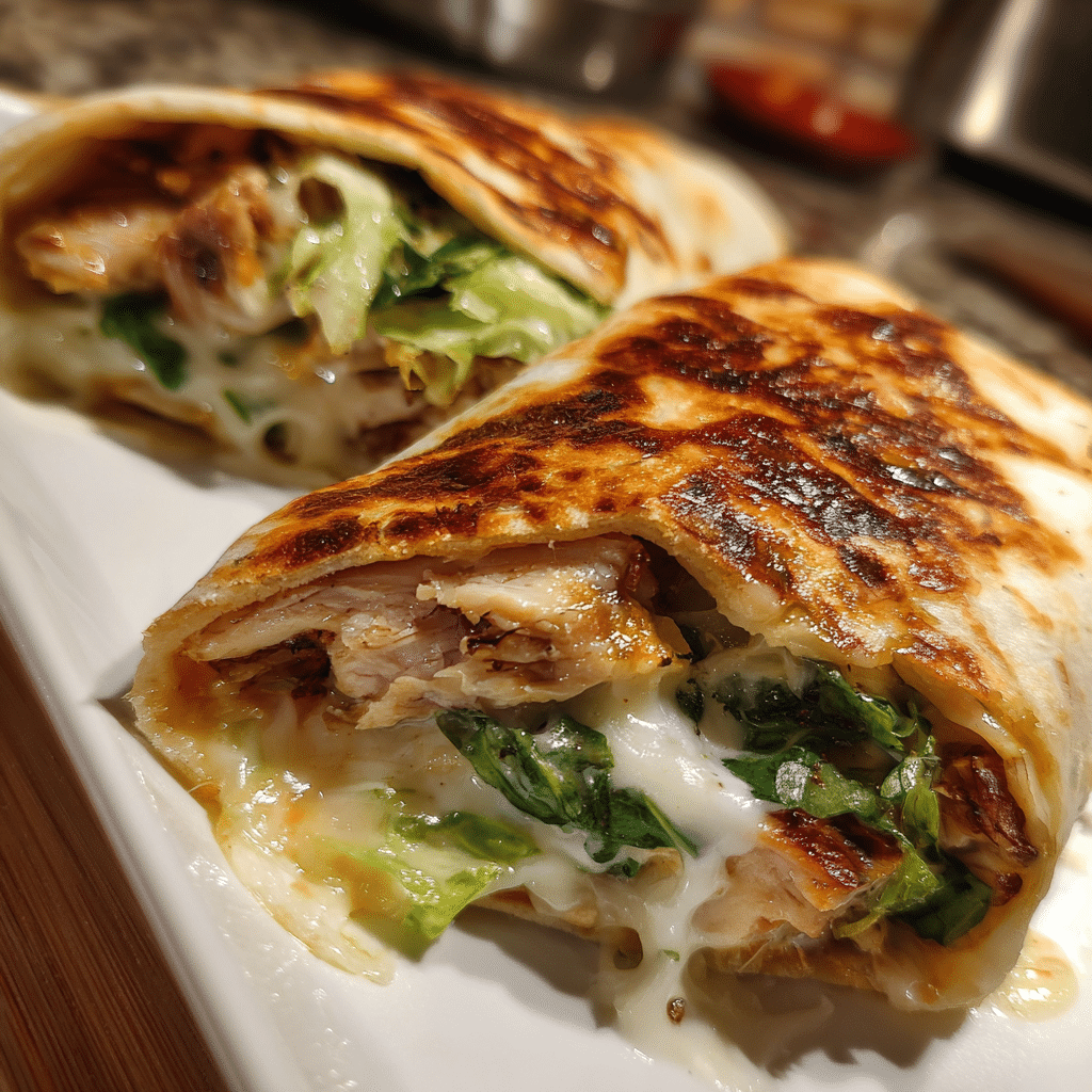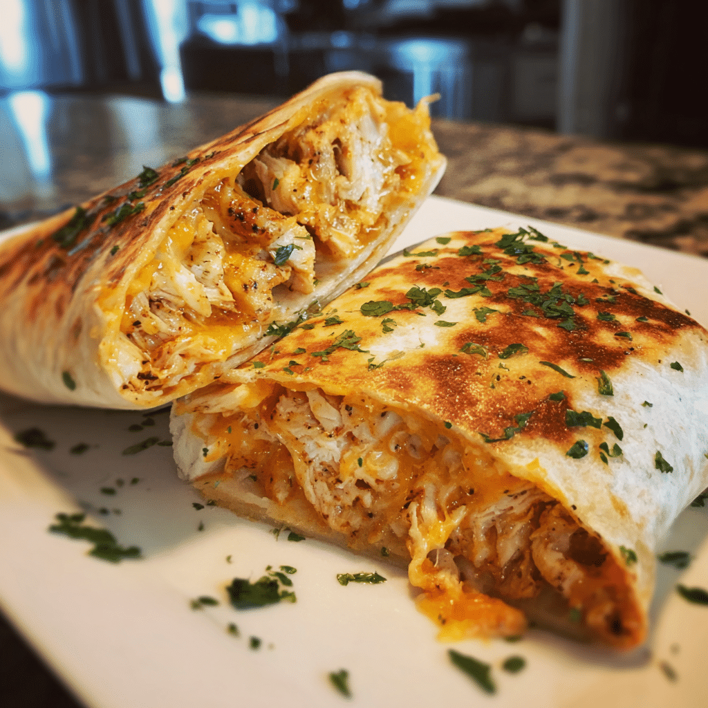 Flavor-packed cheesy garlic chicken wraps filled with tender seasoned chicken, melted cheese, and wrapped in warm tortillas for a quick and satisfying meal.
