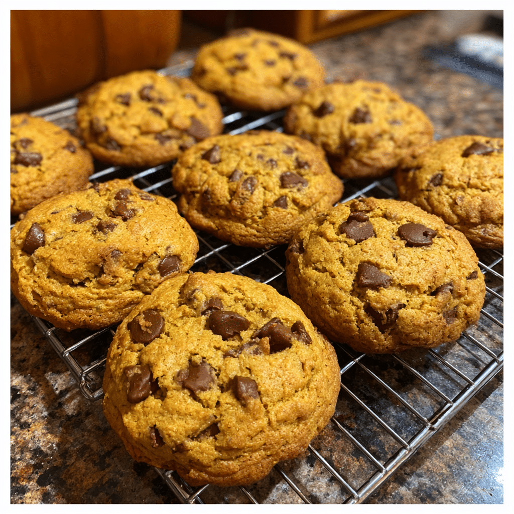 Soft and chewy pumpkin cookies filled with warm spices and sweet chocolate chips, making the perfect fall-inspired treat.