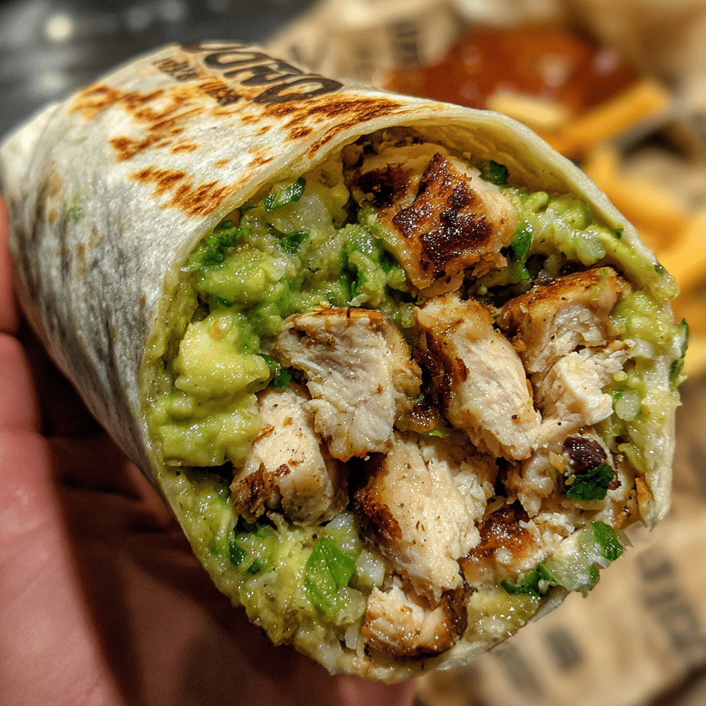 A hearty and healthy burrito filled with juicy chicken, creamy avocado, cheese, and fresh veggies wrapped in a warm tortilla.
