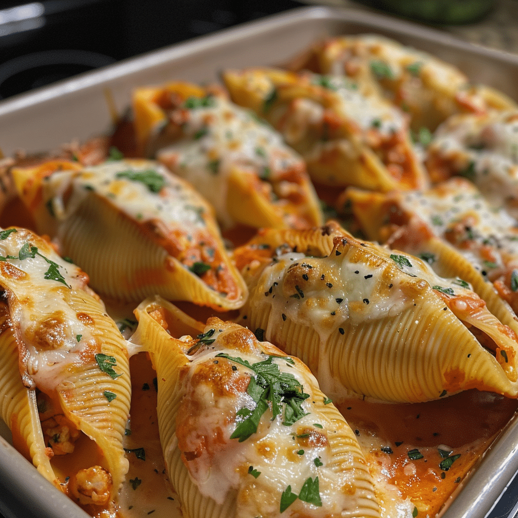 Store leftovers in an airtight container in the refrigerator for up to 3 days. To reheat, cover with foil and warm in a 350°F (175°C) oven for about 15–20 minutes until heated through. You can also freeze the stuffed shells (before baking) for up to 3 months; bake straight from frozen, adding an extra 10–15 minutes to the cook time.