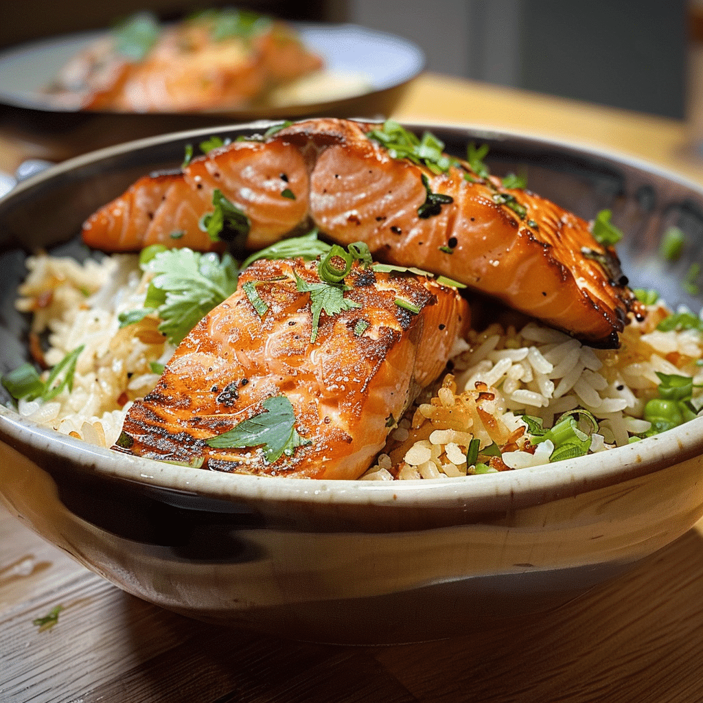 Teriyaki Salmon Rice – Glaze the salmon with teriyaki sauce for a sweet-savory upgrade.
