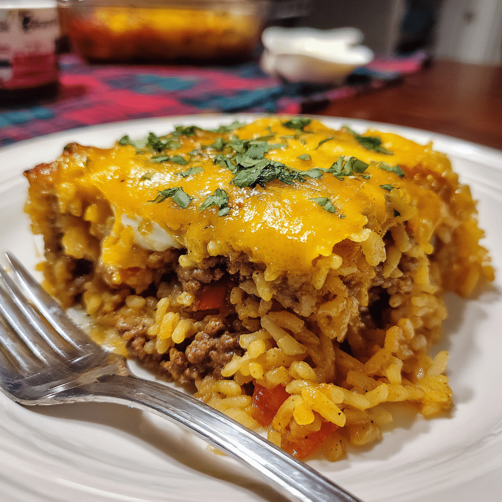 A classic, budget-friendly comfort casserole made with seasoned ground beef, tender rice, and a creamy, savory sauce baked until hot and satisfying.