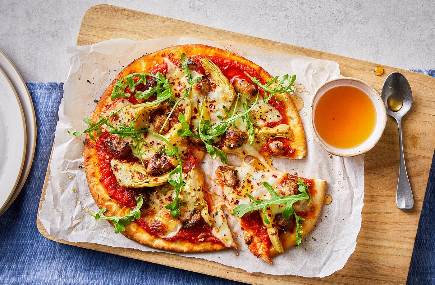 To make it vegetarian, replace sausage with sautéed mushrooms and caramelized onions. The sweetness of the onions pairs wonderfully with the honey drizzle.
