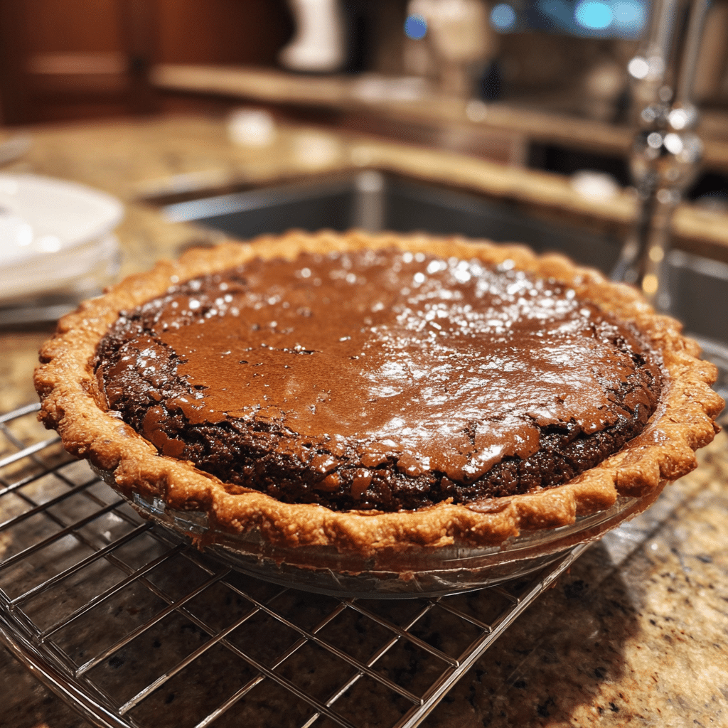 An ultra-rich, gooey brownie baked in a pie crust with a fudgy center and crackly top, perfect for chocolate lovers.