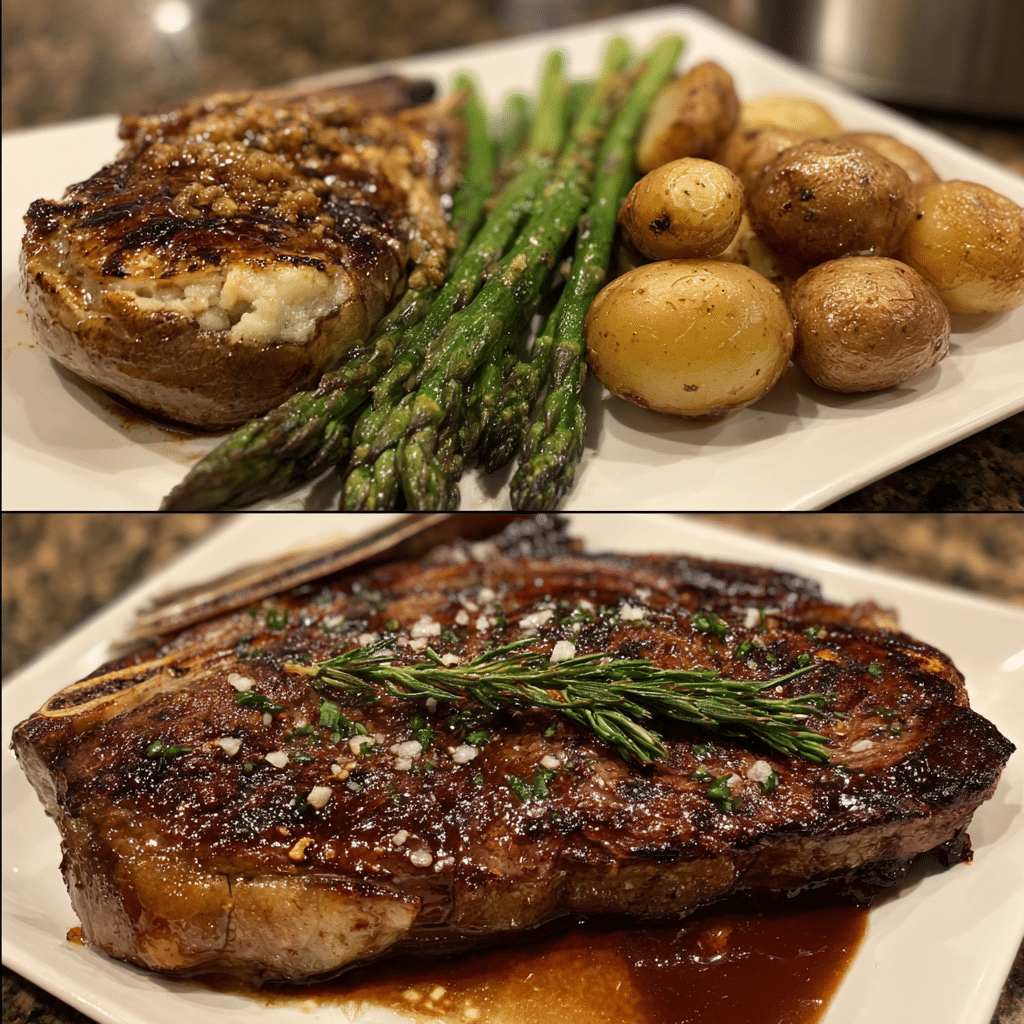 A bold and satisfying grilled steak dinner featuring perfectly seasoned, juicy steaks served with classic sides for a full steakhouse-style extravaganza at home.