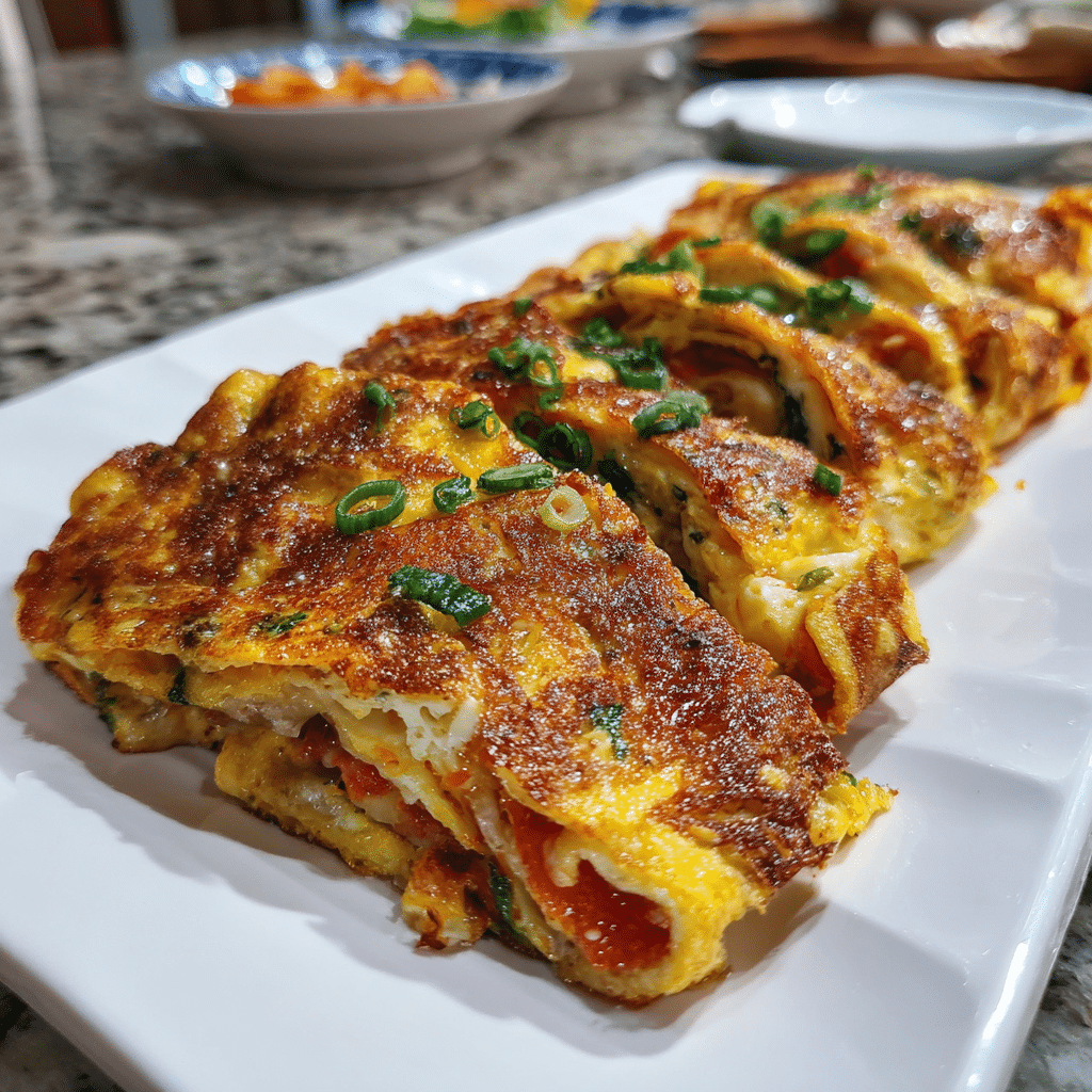 A light and fluffy Korean rolled omelette made with seasoned eggs, often filled with vegetables, and sliced into bite-sized pieces for a simple side dish or snack.