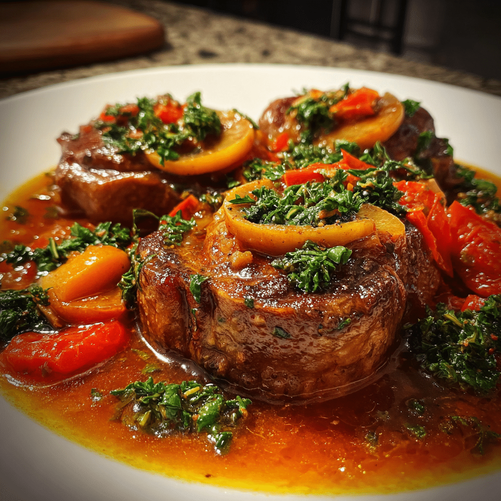 A classic Italian braised veal shank dish slowly cooked with vegetables, white wine, and broth until tender, traditionally finished with aromatic gremolata.