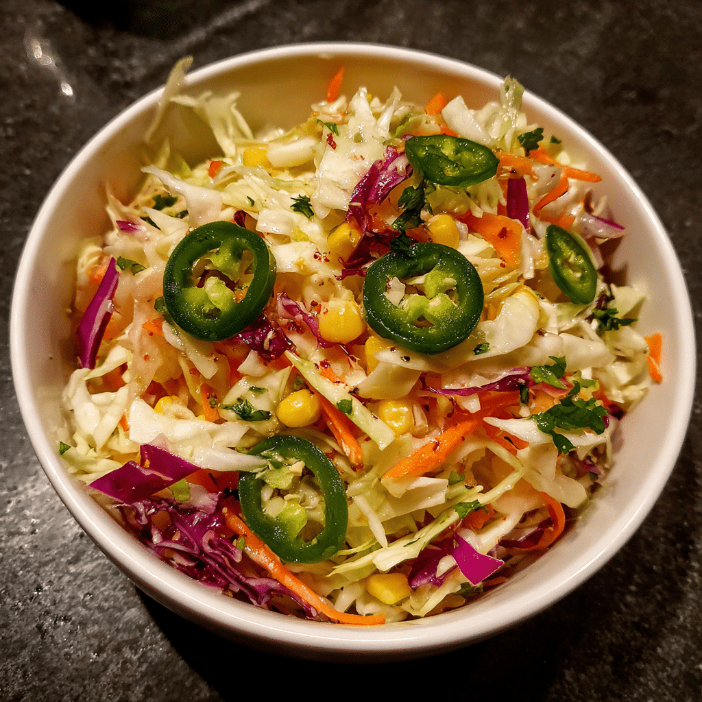 A fresh and zesty coleslaw made with crunchy cabbage, sweet corn, and spicy jalapeño tossed in a creamy, tangy dressing.