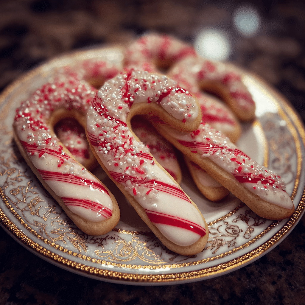 Whimsical holiday cookies shaped like candy canes, made from vanilla and peppermint-flavored dough twisted together for a festive and magical Christmas treat.