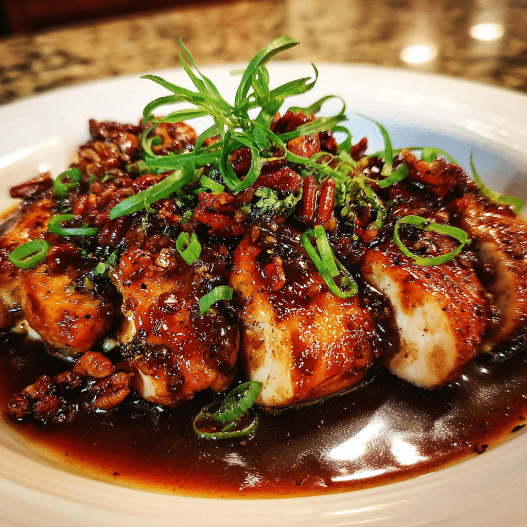 Return the chicken to the skillet, spooning the glaze generously over each piece. Sprinkle with toasted pecans and let everything cook together for 2 minutes so the flavors meld beautifully. Finish with fresh thyme or rosemary for an aromatic final touch.