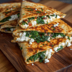 Crispy golden quesadillas filled with sautéed spinach, tangy feta cheese, and Mediterranean herbs for a flavorful vegetarian twist on a classic favorite.
