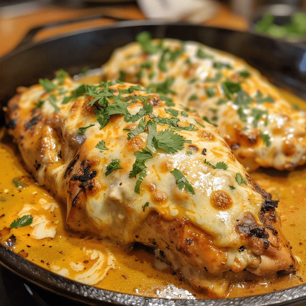Return the chicken to the pan, spooning the cheese sauce over each piece. Let it simmer gently for a few minutes so the flavors meld together. Top with sliced jalapeños and fresh cilantro before serving. This dish pairs beautifully with rice, warm tortillas, or roasted vegetables.