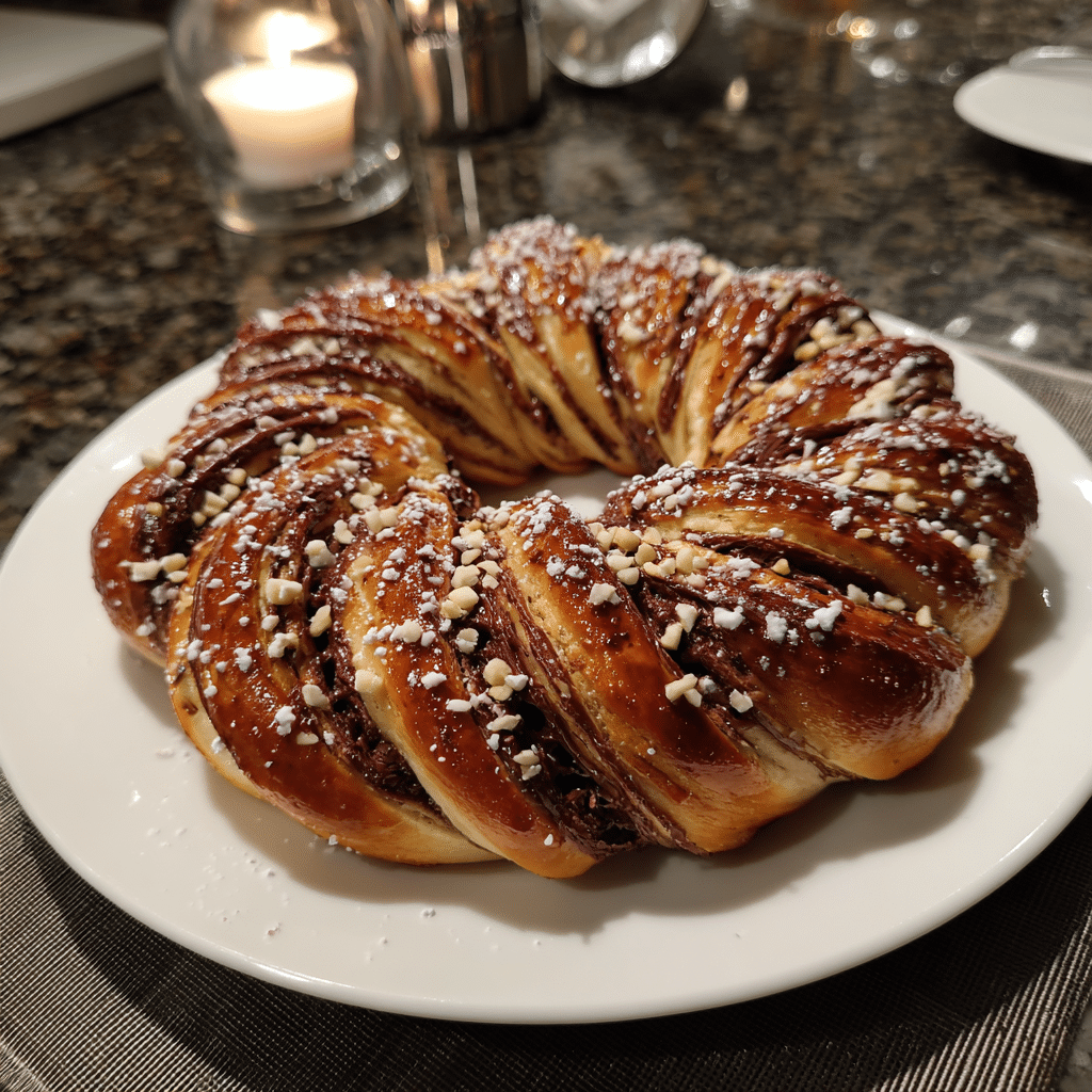 A festive Nutella Christmas wreath pastry made with flaky puff pastry, rich chocolate-hazelnut spread, and shaped into a beautiful holiday centerpiece.