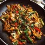 Street-style Thai Drunken Noodles—known in Thailand as Pad Kee Mao—are the ultimate comfort food with a kick. This dish combines chewy rice noodles with sizzling garlic, fresh Thai basil, and a bold sauce that perfectly balances spicy, salty, and sweet flavors. Despite its name, there’s no alcohol involved—these noodles get their “drunken” reputation from being so deliciously spicy and satisfying that you’ll want to devour them after a long day. I once made this recipe with extra Thai basil and a squeeze of lime at the end, and the freshness transformed the dish completely. Ready in under 30 minutes, it’s a quick, fiery, and flavor-packed meal that brings authentic Thai street food straight to your kitchen.