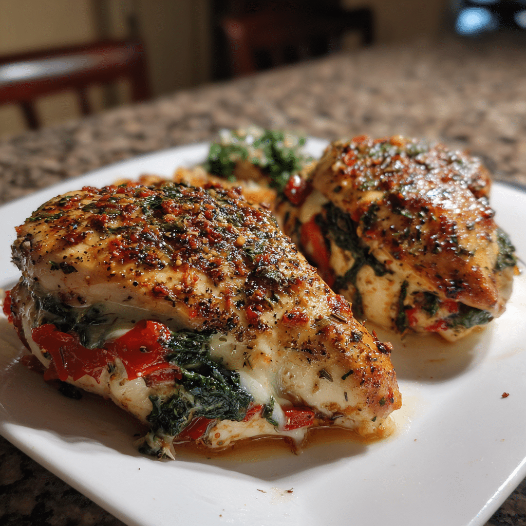 Roasted Red Pepper, Spinach, and Mozzarella Stuffed Chicken is a flavorful and elegant dish made with juicy chicken breasts filled with roasted red peppers, fresh spinach, and gooey mozzarella, baked until golden and cheesy.