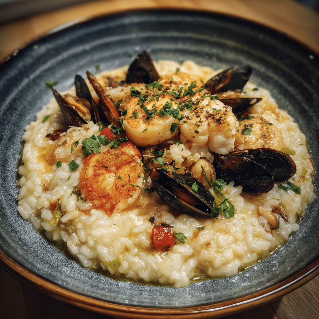 A luxurious and creamy seafood risotto made with tender rice slowly cooked in broth and finished with shrimp, scallops, and a touch of parmesan for classic comfort.