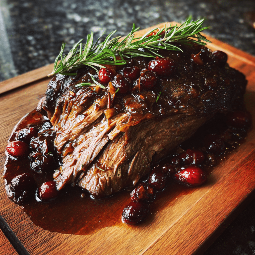 A tender slow-braised beef roast cooked until fall-apart soft and finished with a tangy-sweet cranberry balsamic glaze, perfect for a comforting yet elegant dinner.