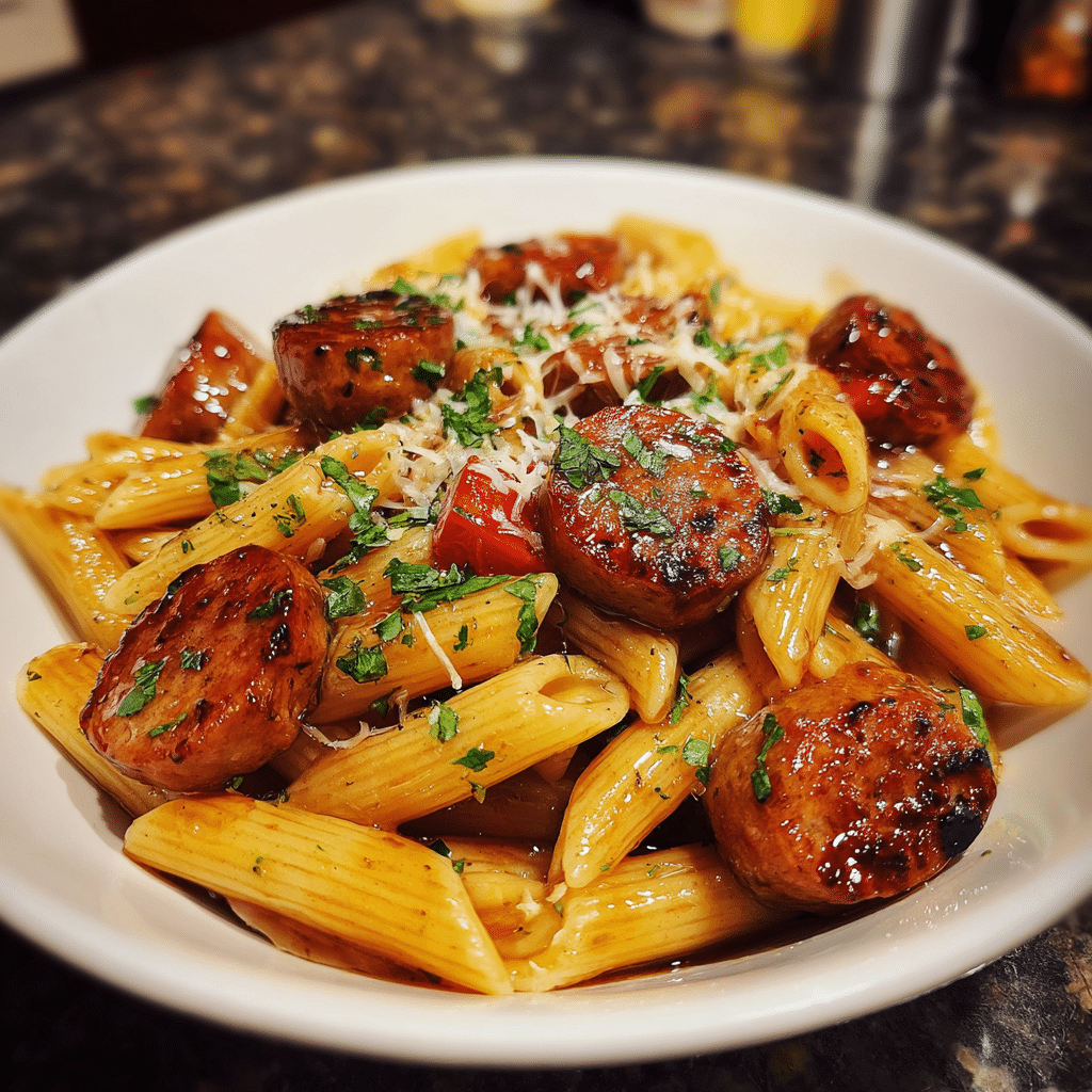 Start by cooking the pasta according to package instructions until al dente. Reserve a small cup of pasta water, then drain and set aside. Heat a large skillet over medium-high heat and melt the butter. Add the sliced sausage and sear until the edges become caramelized and golden. Reduce heat slightly and stir in the minced garlic, cooking until fragrant but not browned. Whisk in the honey, soy sauce, chicken broth, and a pinch of red pepper flakes. Allow the mixture to simmer until it begins to thicken into a glossy glaze.