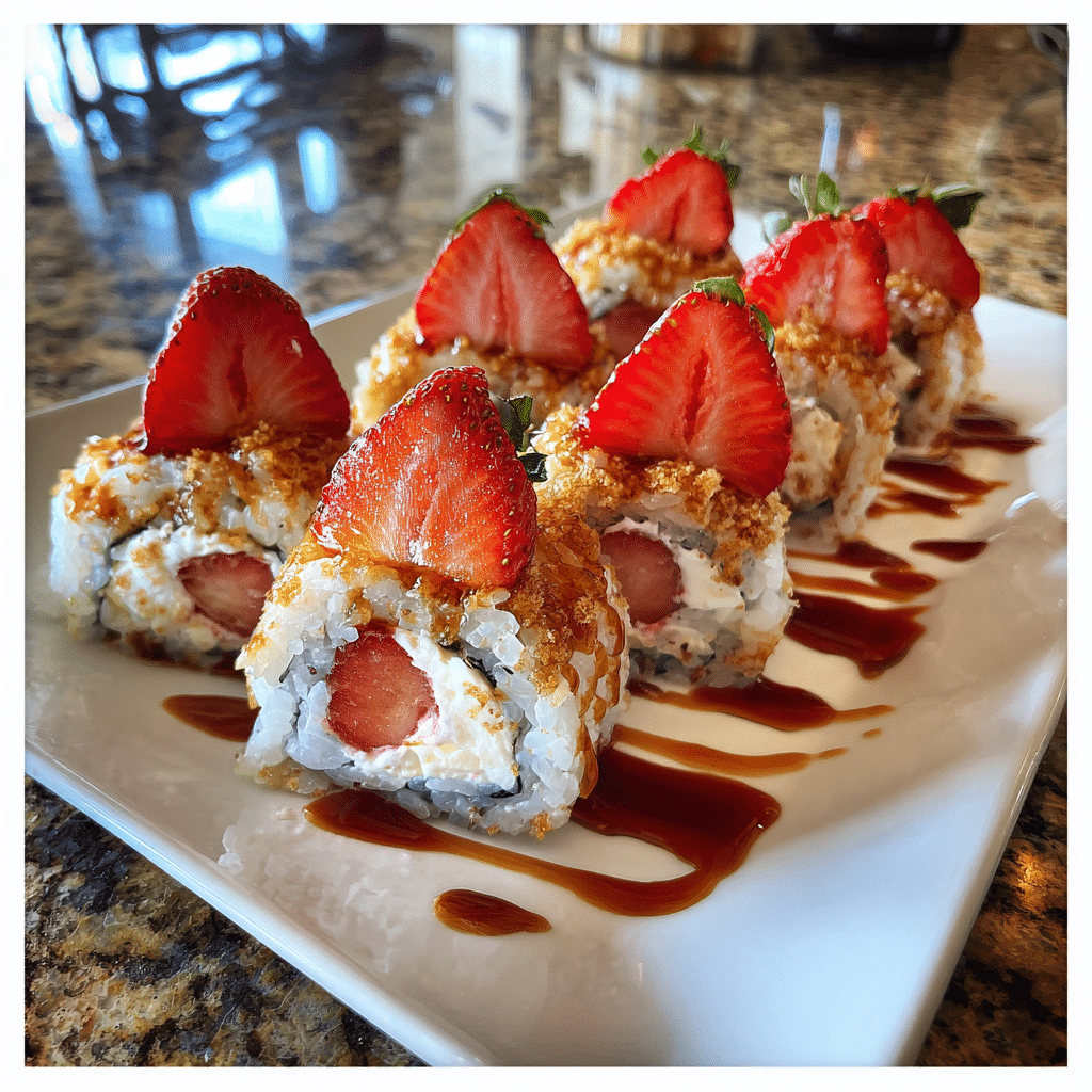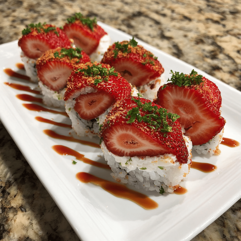 Store any leftover sushi rolls in an airtight container in the refrigerator for up to 2 days. Because of the fresh strawberries and whipped cream filling, this dessert is best enjoyed soon after preparation. Freezing is not recommended, as it can alter the texture of both the fruit and the cream.