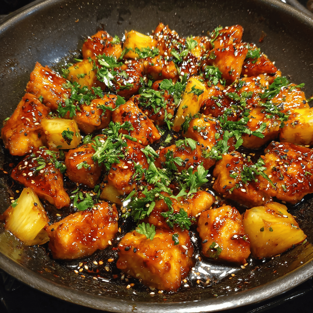 Stir the chicken back into the skillet, then add pineapple chunks. Toss until everything is coated in the sauce and heated through. Garnish with sliced green onions and sesame seeds.